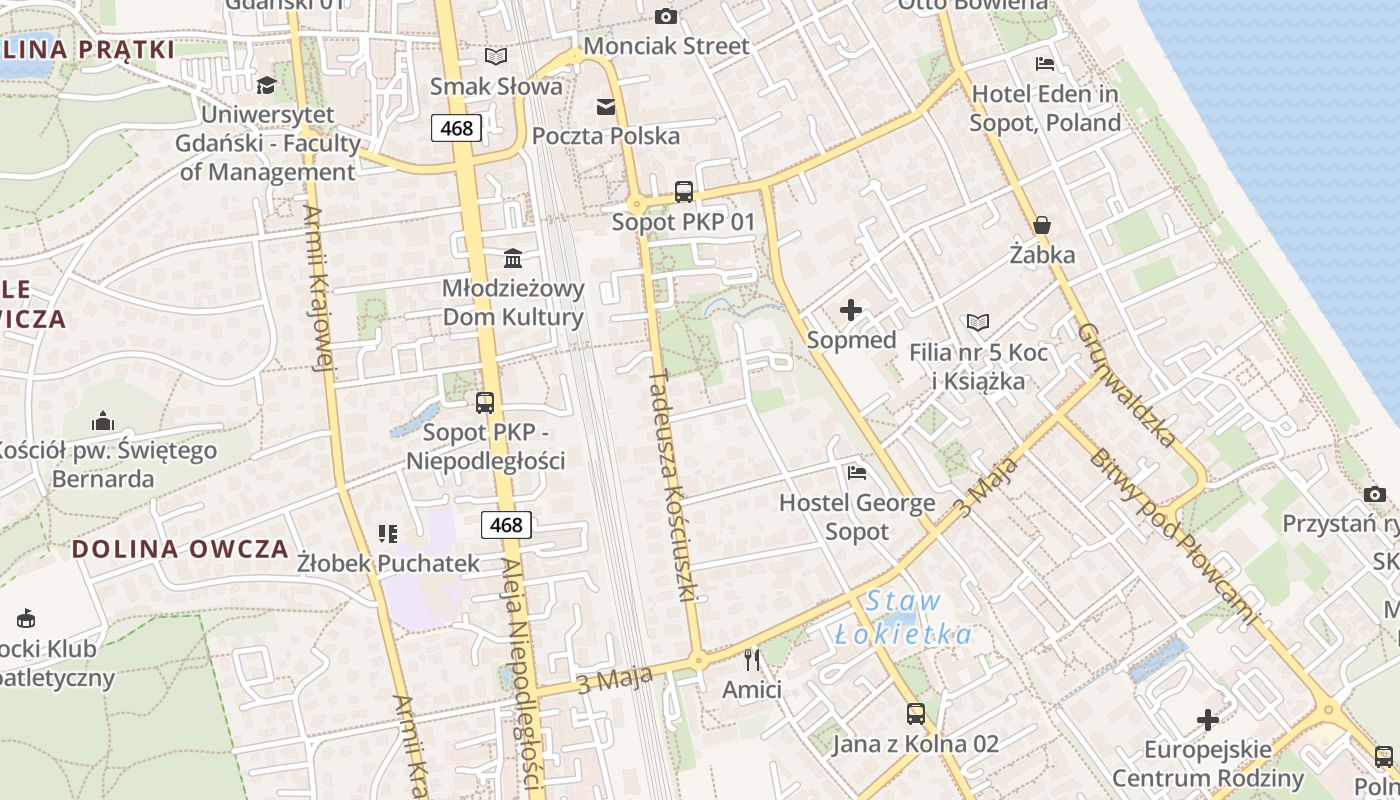 Hotel w dzielnicy Dolny Sopot jest usytuowany jedynie 1 km od Parku Północnego i nie więcej niż 600 m od takich miejsc zakupów jak Sopot CENTRUM. Popularne atrakcje przyrodnicze w pobliżu tego hotelu to Plaża Sopot (850 m) i Park Oliwski (3 km). Obiekt noclegowy zapewnia również dostęp do atrakcji sportowych, takich jak Hala Sopot-Gdańsk, w około 2 km. Ten hotel leży o krok od przystanku Sobieskiego - Przychodnia 02. Aparthotel Chummy House Sopot znajduje się około 30 minut drogi od lotniska Gdańsk im. Lecha Wałęsy, które jest 25 km stąd.
